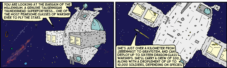 I've mentioned the personalities of both of the past two ships on this list as being among their strengths, and I feel like it would be silly for me not to acknowledge that that is the main reason the PDCL is on this list. In the Schlockiverse large warships of this nature are piloted and operated not by their crew, but instead by a hyper-intelligent A.I. So the ships literally do have bespoke personalities. In this case, his name is Petey, and because of his humor, brilliance, and the underlying constant threat of him literally being suicidal, he is one of the most interesting ships represented in the entire comic.